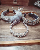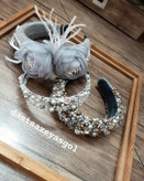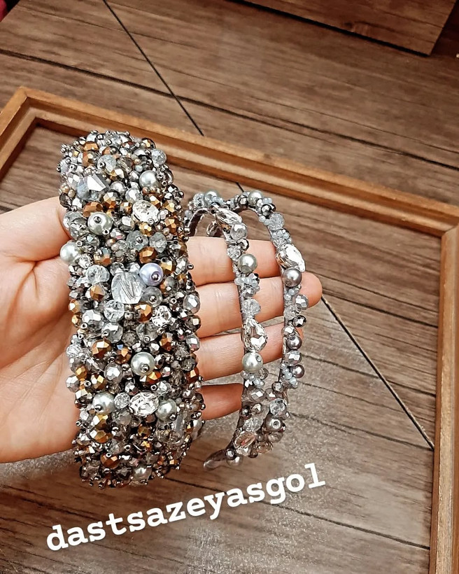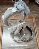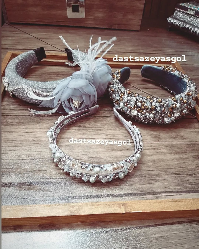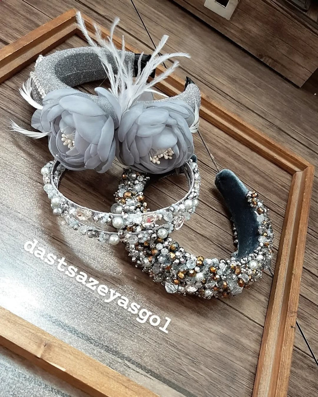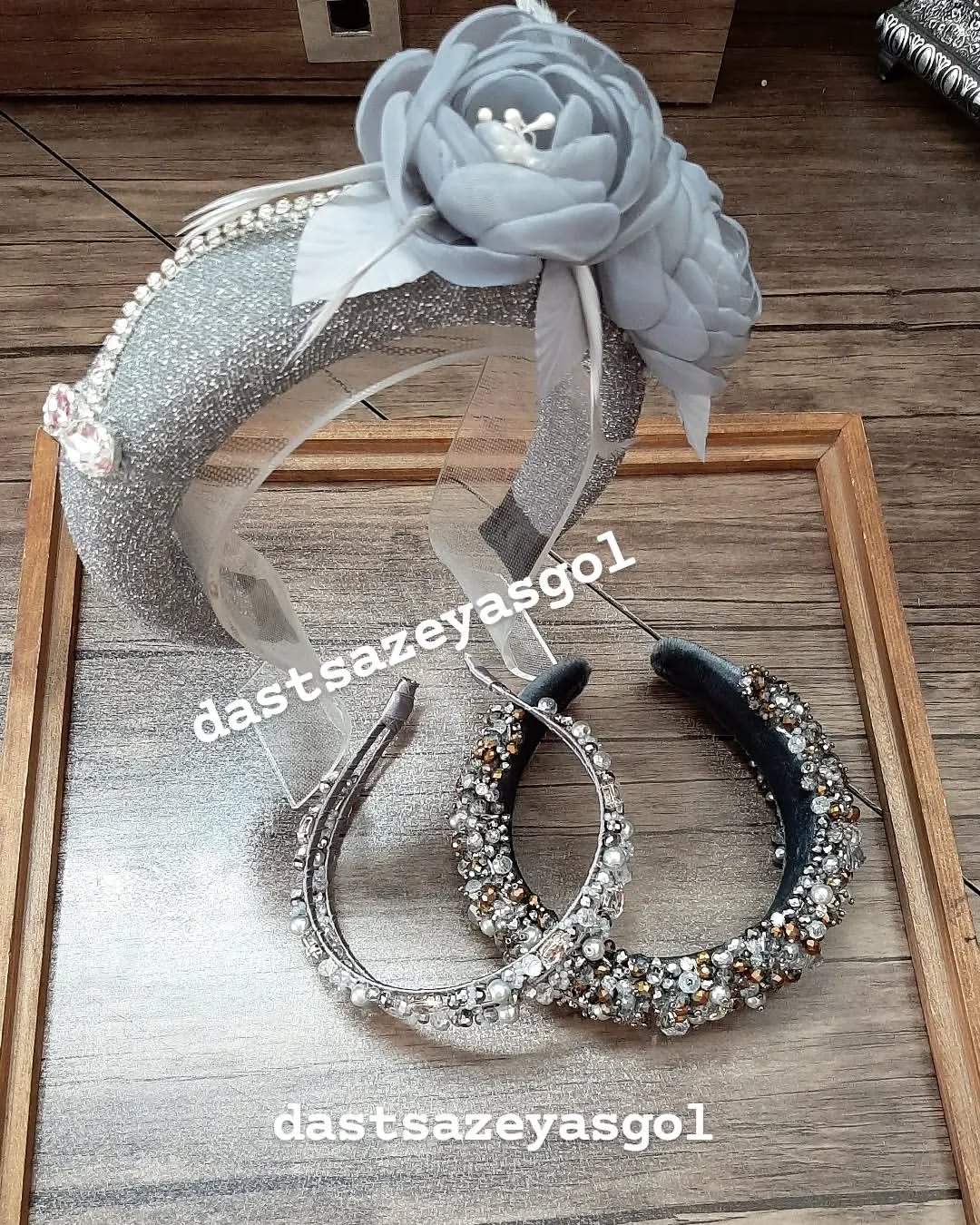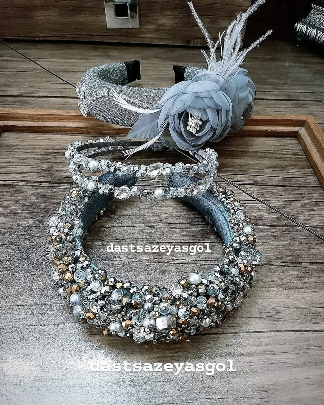 تل ابری حجیم ترکیب کریستالهای طلایی ونقره ای وکلی نگین های اصل ودرجه یکه با هر رنگ لباسی ست هست. تل دوقلو نقر توسی که بسیار ظریف کار شده با تک نگینهای اشکی وکریستال وملیله. تل ابری حجیم با تزیین گل بغل سر ونگین کلی رنگبندی داره.