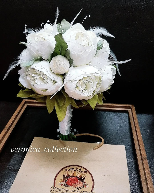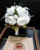 دسته گل کلاسیک با گلهای پئونی و تزیین مروارید و پر و برگهای سبز از عروسانه ترینهای دسته گلها.جنس گلها درجه یک وسبک دستهگل کلاسیک وسایز خیلی بزرگ هست تم سفید