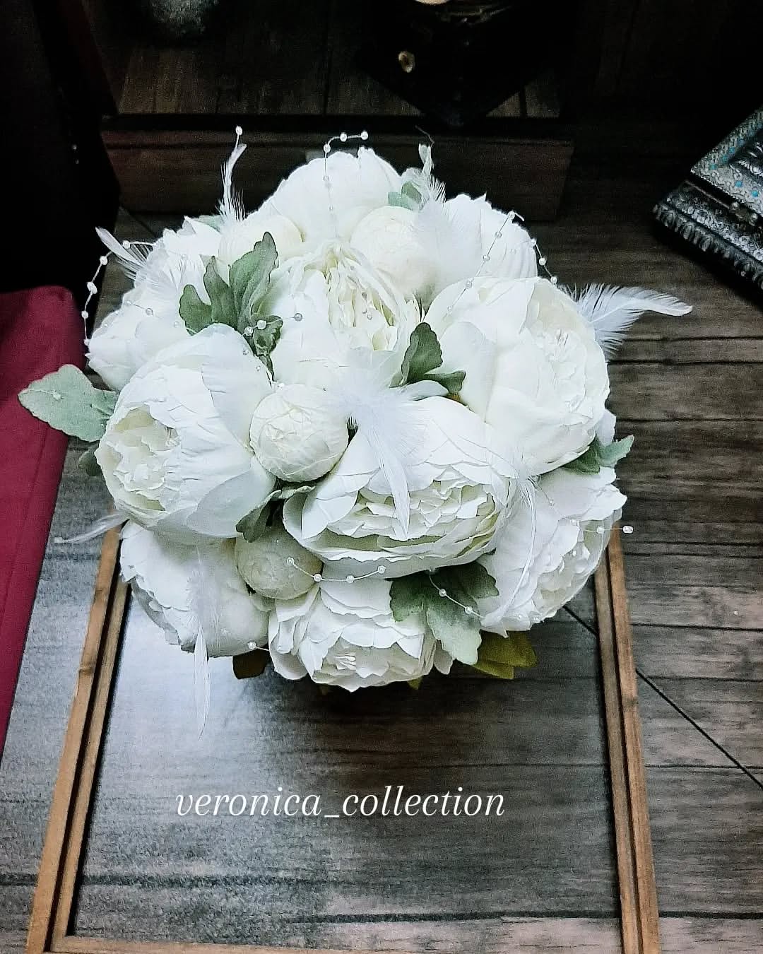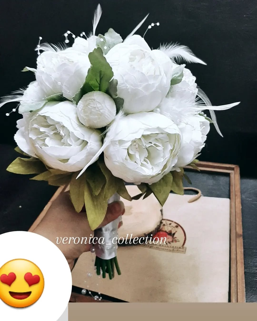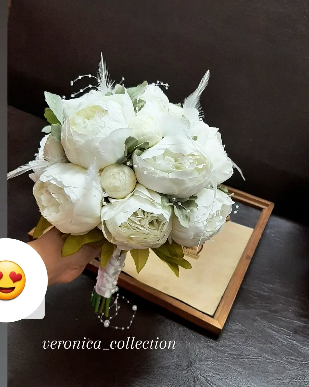 دسته گل کلاسیک با گلهای پئونی و تزیین مروارید و پر و برگهای سبز از عروسانه ترینهای دسته گلها.جنس گلها درجه یک وسبک دستهگل کلاسیک وسایز خیلی بزرگ هست تم سفید