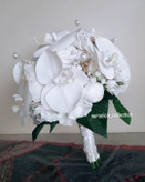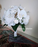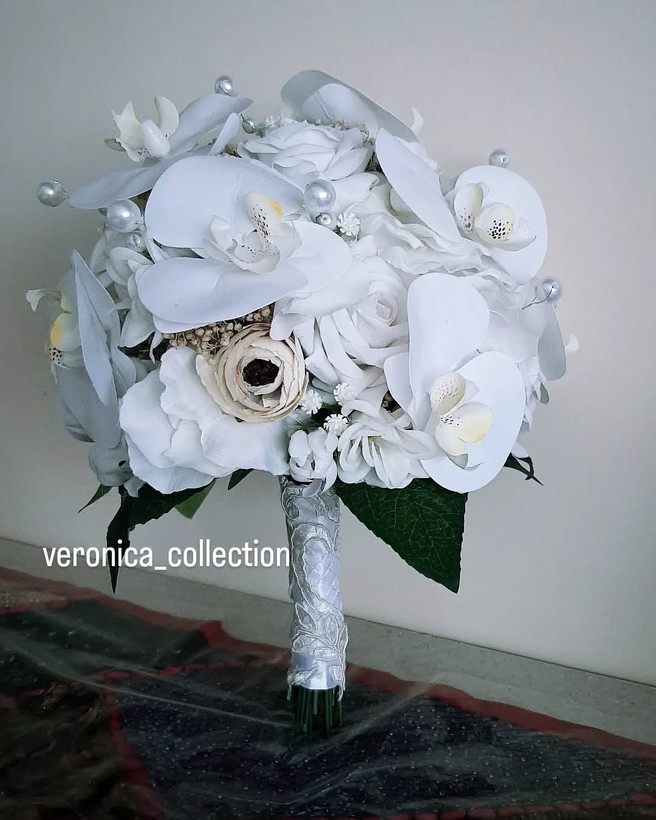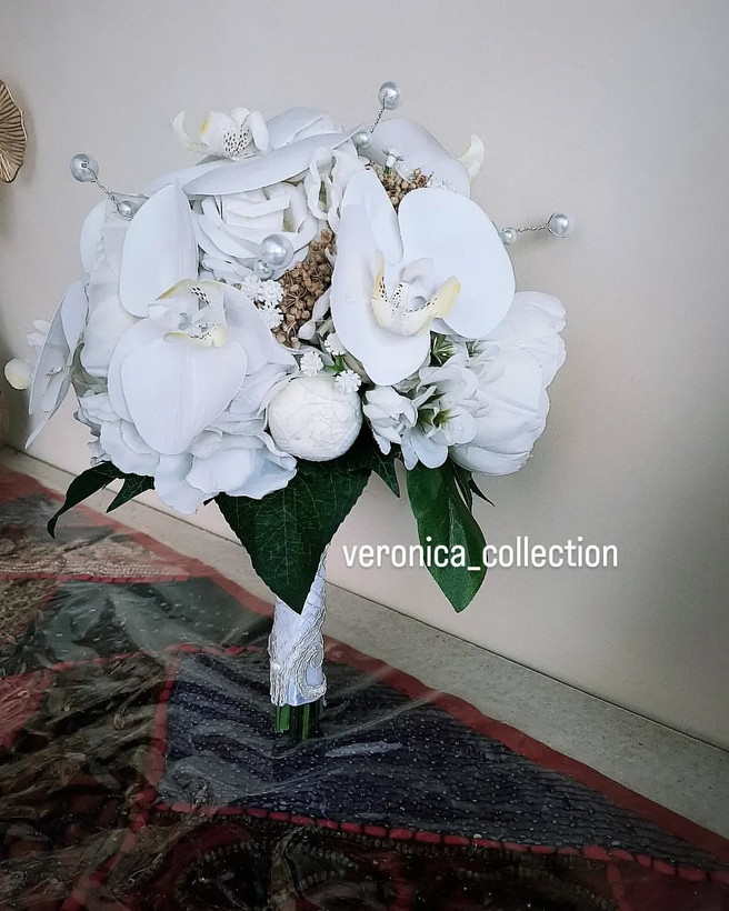 این دسته گل کلاسیک که ترکیب گلهای ارکیده لمسی و پئونی ورز و ژیپسوست که به سلیقه عروس کمی گلهای خشک کرم هم داخلش زده شده و تزیین مروارید و دسته هم طبق سلیقه عروس دانتل برجسته خورده.