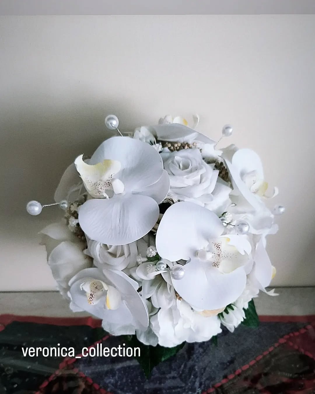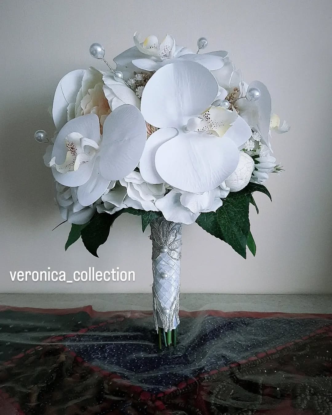 این دسته گل کلاسیک که ترکیب گلهای ارکیده لمسی و پئونی ورز و ژیپسوست که به سلیقه عروس کمی گلهای خشک کرم هم داخلش زده شده و تزیین مروارید و دسته هم طبق سلیقه عروس دانتل برجسته خورده.