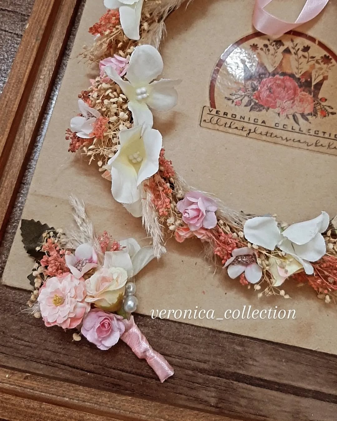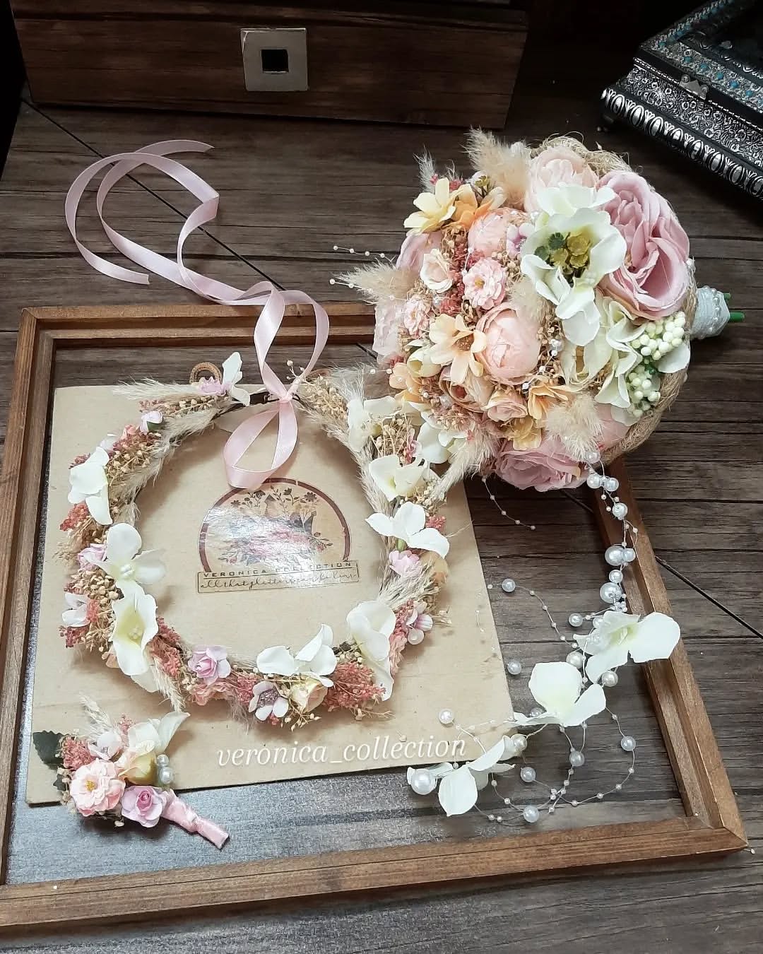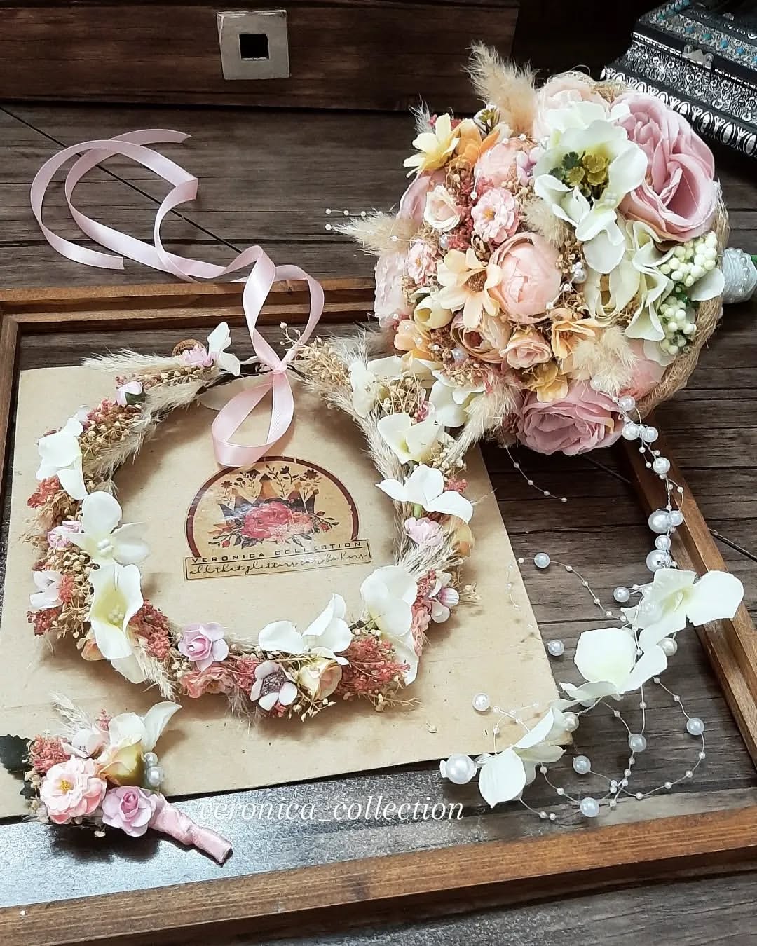 ست دسته گل سازه دار و تاج گل و گل جیب داماد به عروس خانم. دسته گلهای سازه دار مدل لونه مناسب عقد و نامزدی و فرمالیته. تم کار صورتی شیری و کمی گلبهی ملایم.