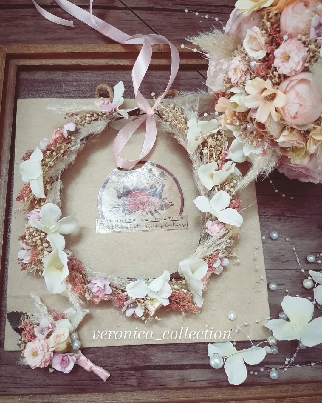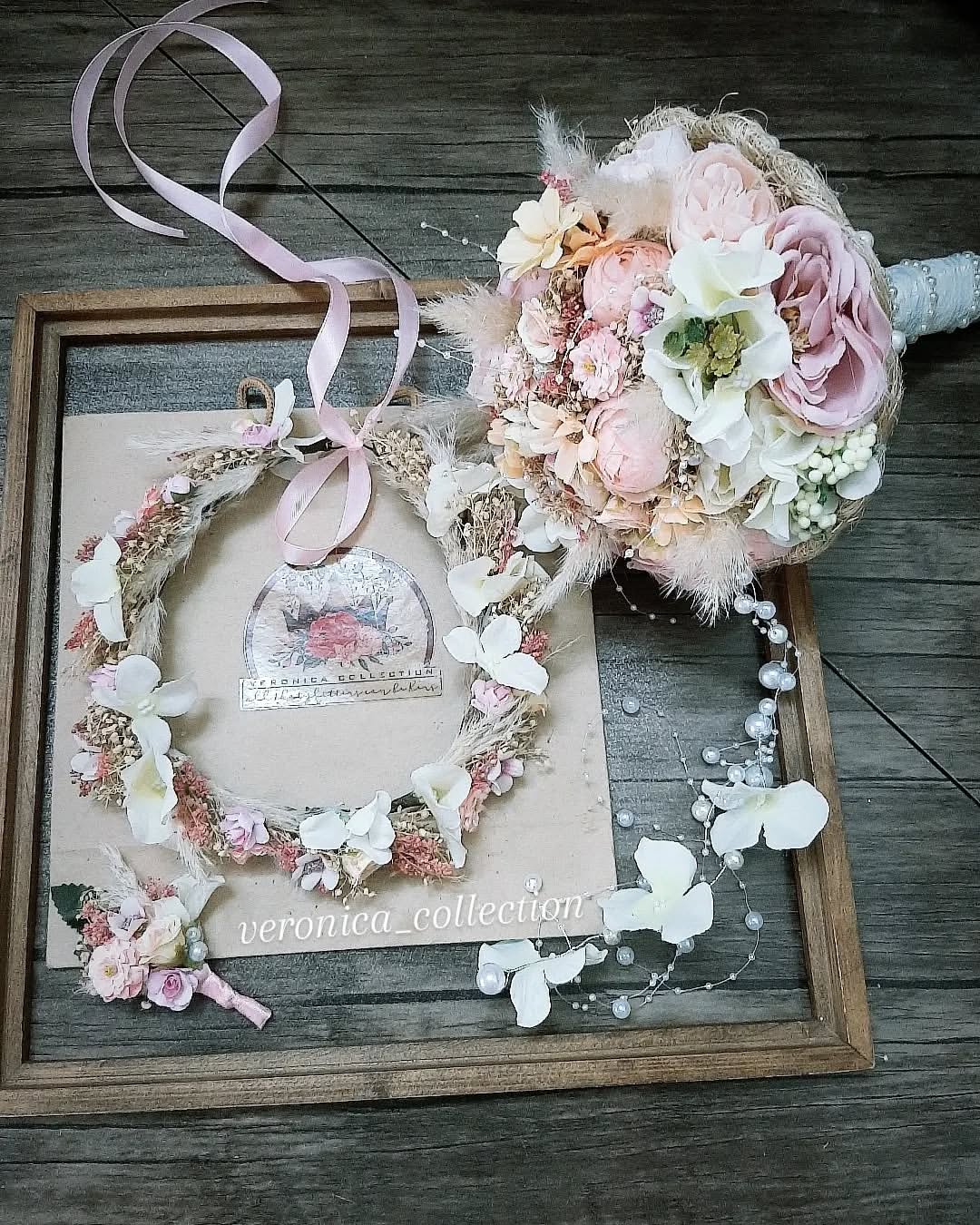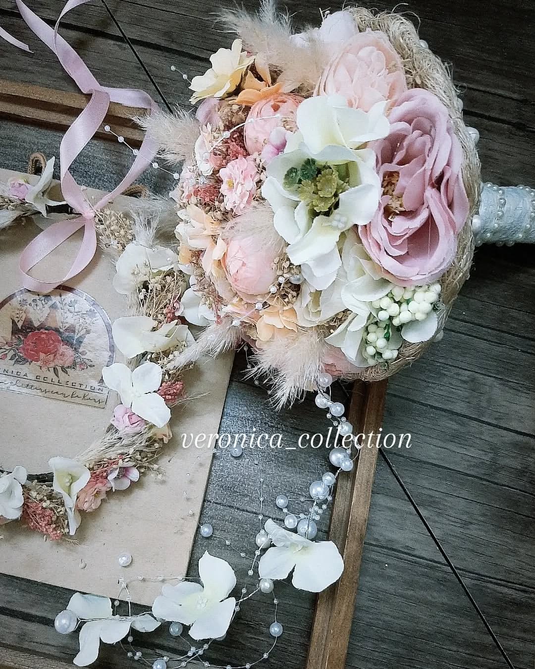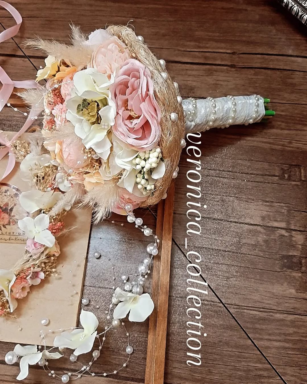 ست دسته گل سازه دار و تاج گل و گل جیب داماد به عروس خانم. دسته گلهای سازه دار مدل لونه مناسب عقد و نامزدی و فرمالیته. تم کار صورتی شیری و کمی گلبهی ملایم.