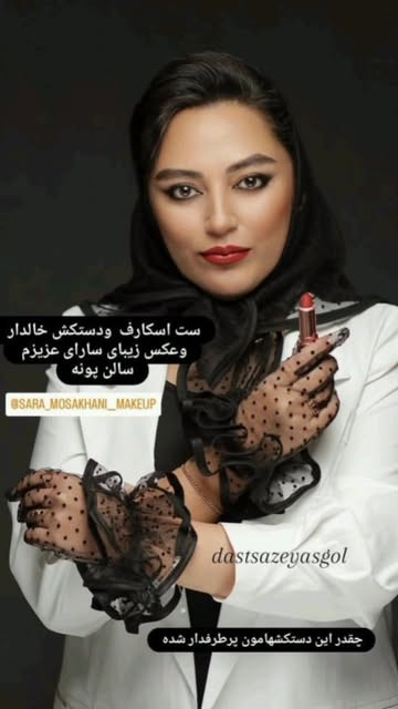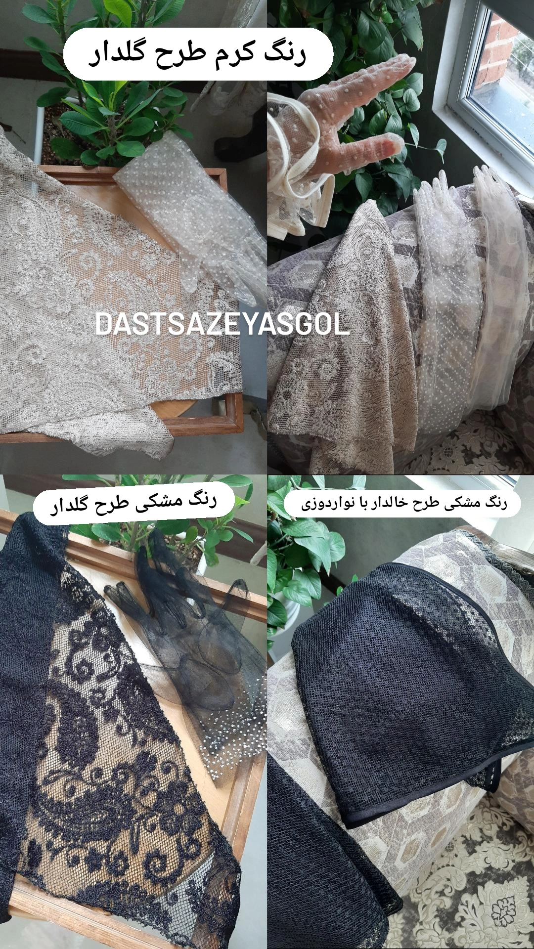 این نمونه تور خالدار نواردوزی شده دوتا دور اسکارف و اندازه ۷۵ در ۷۵ هست که در رنگ دلخواه و تور ساده میتونید بدید ست دستکشش هم هم کوتاه و هم بلند با کلی تنوع مدل و رنگ هایلایت دستکش.