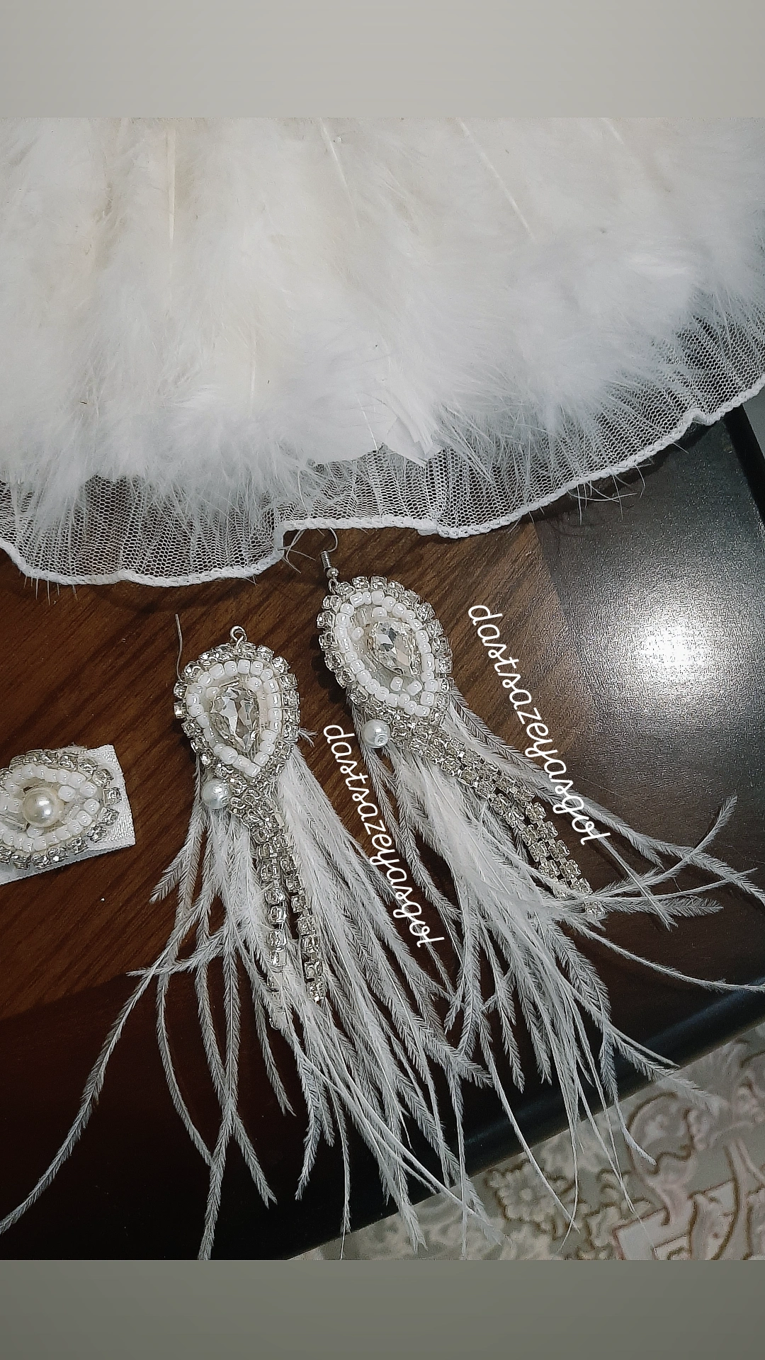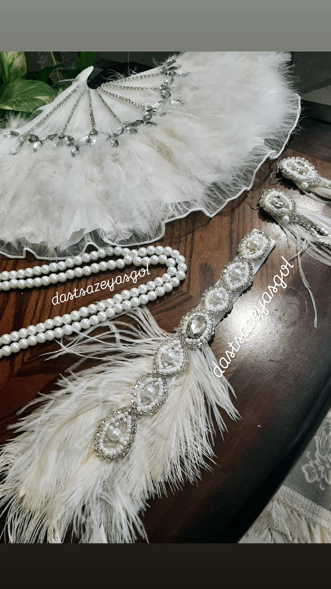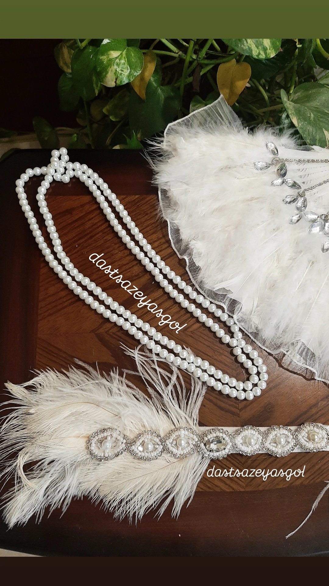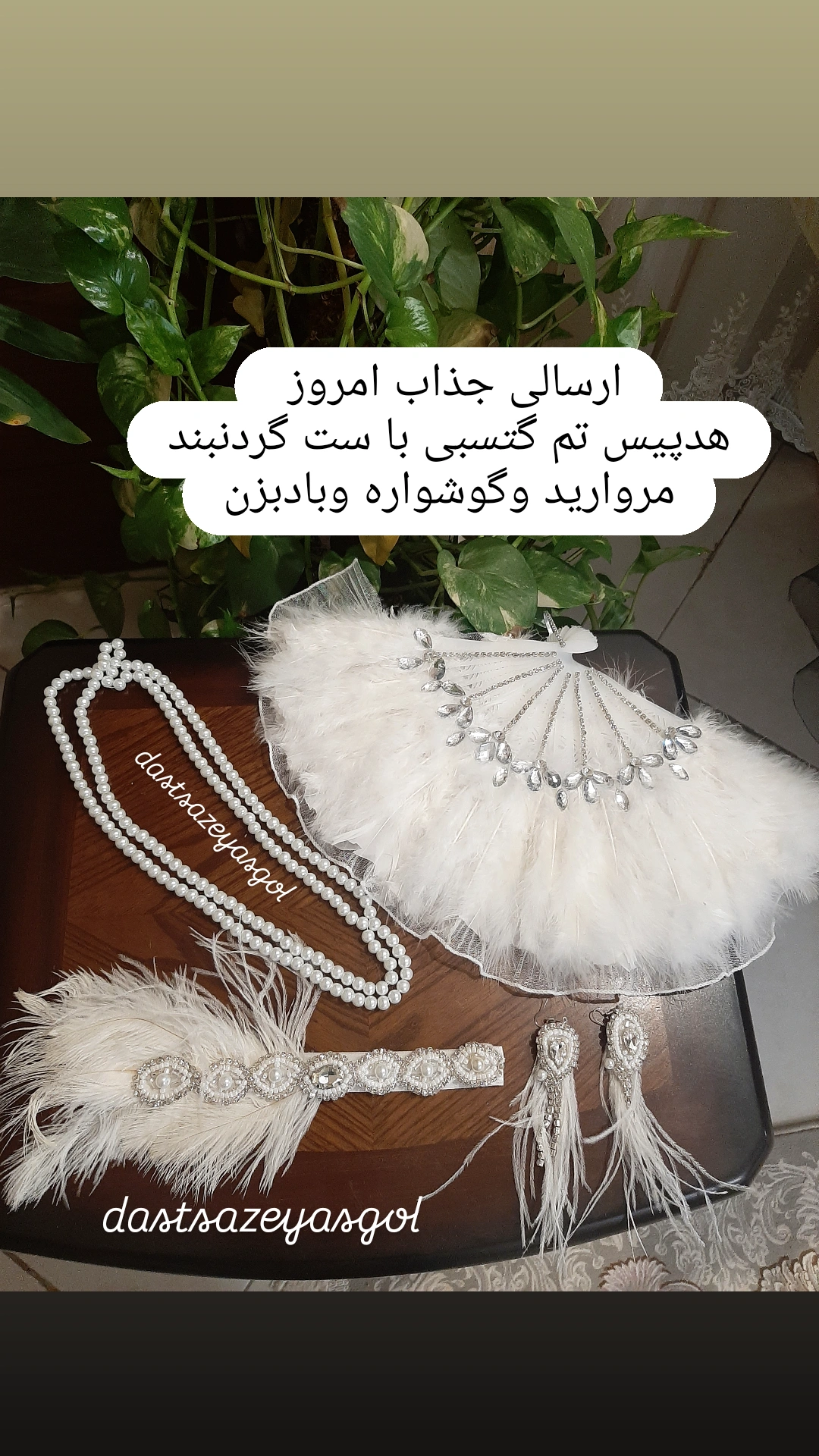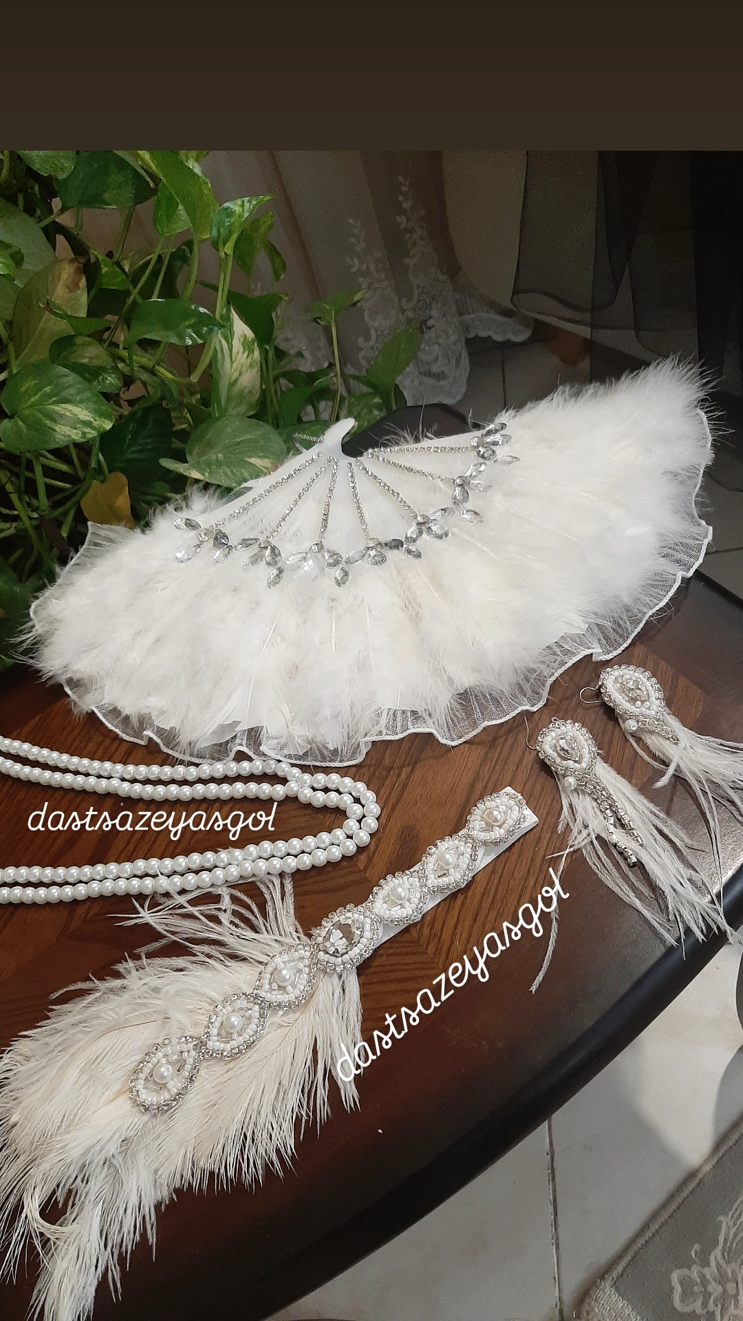 ست جذاب شامل بادبزن دورو، گردنبند بلند مروارید، گوشواره و هدپیس جواهردوزی حرفه ای که مناسب همه سنین و مراسمهاست.