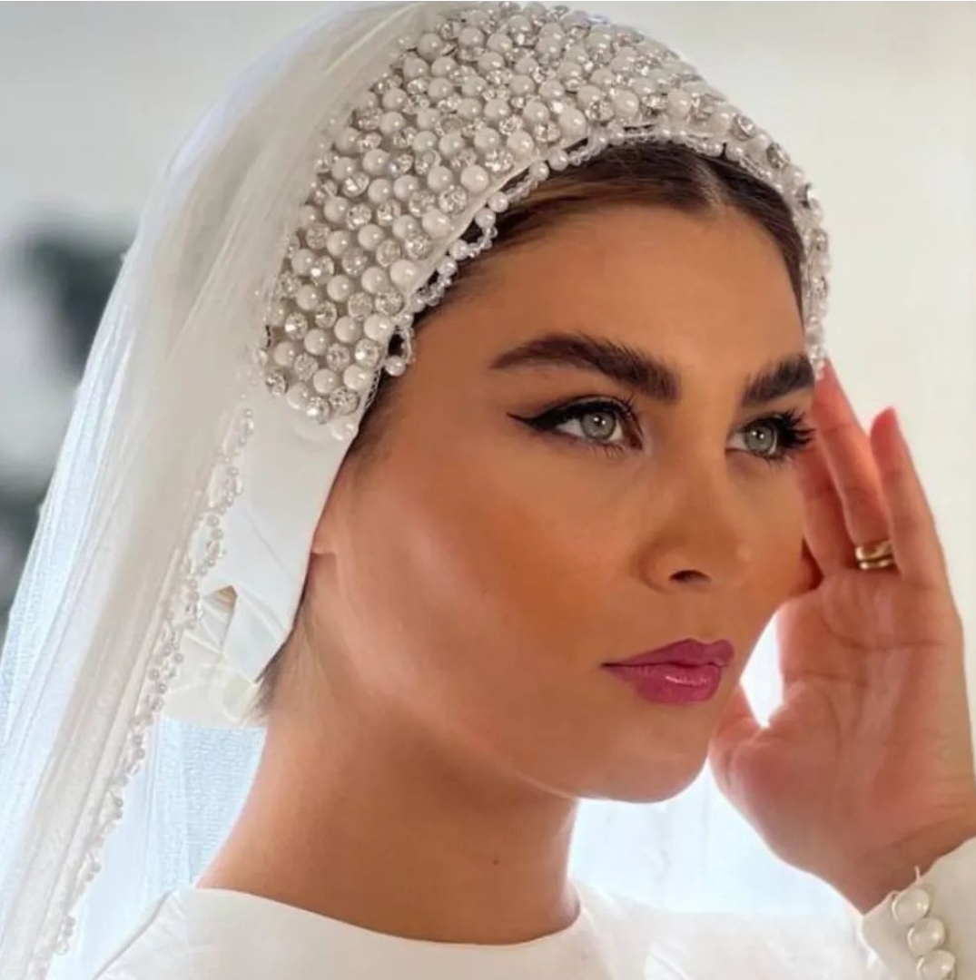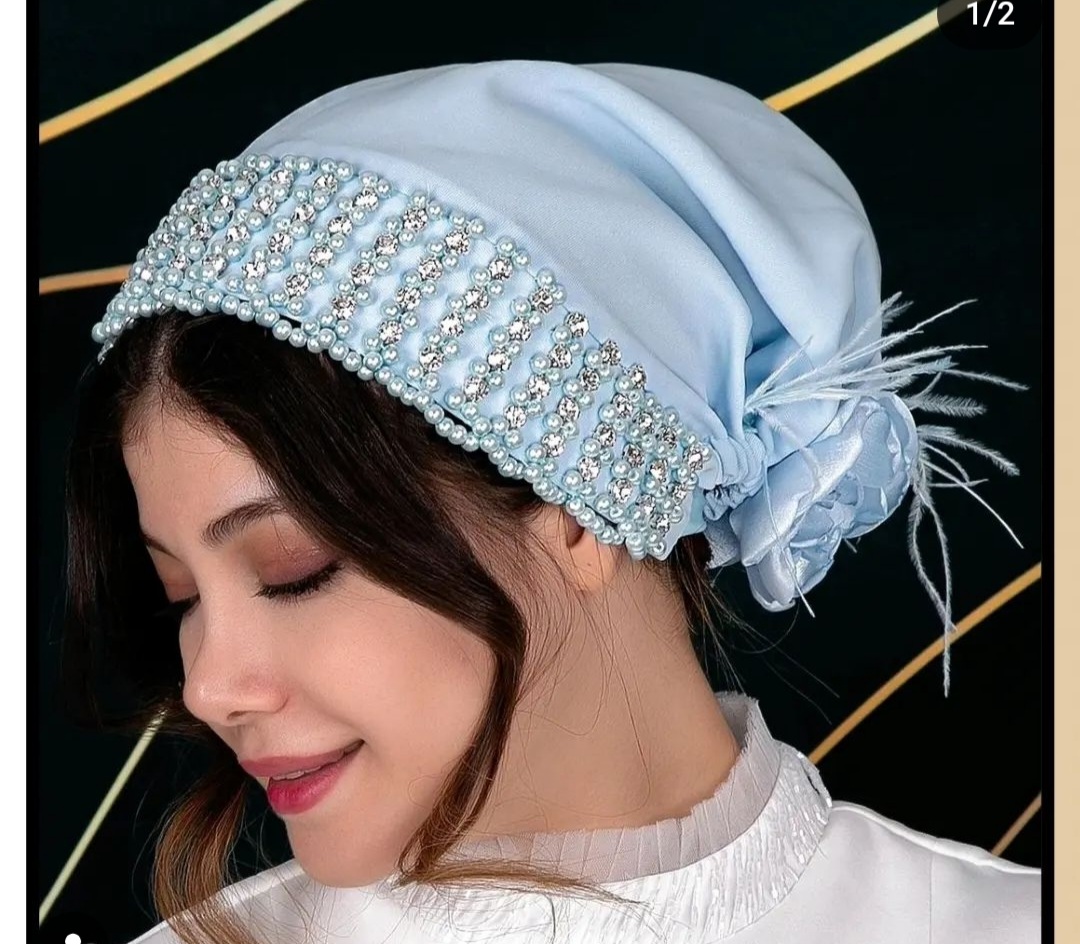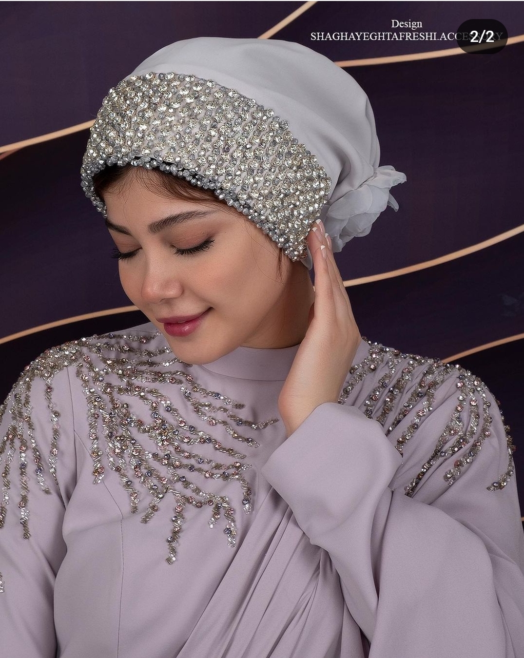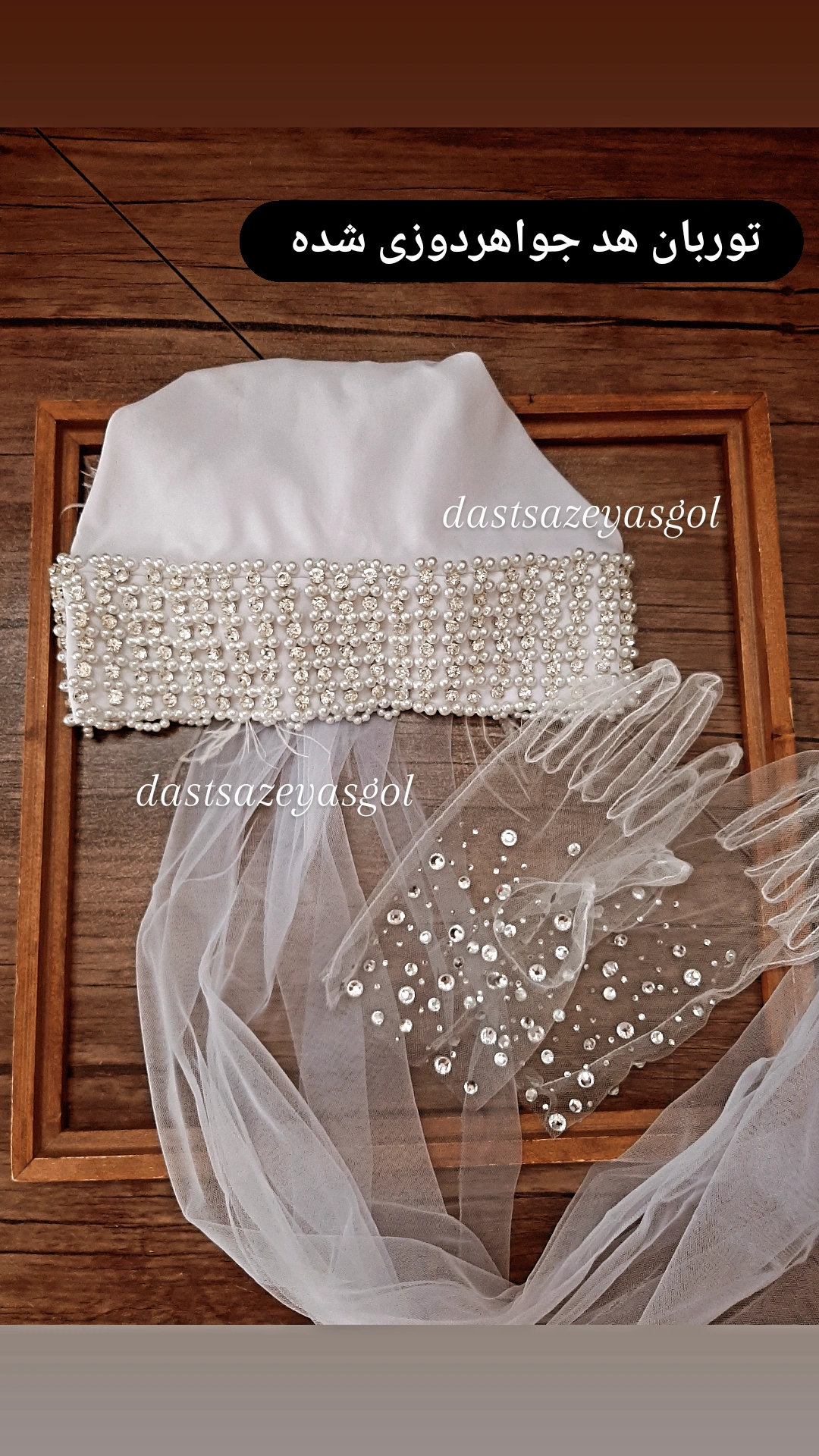 توربان جواهردوزی شده با اویز تور از پشت سر که سه گل دستساز وپر هم پشت کار خورده. این توربان پرکار وشیک رو در رنگ دلخواه ومدل دلخواه میتونید بدید. سه مدل متنوع داره: مدل تور از بالای سر، مدل شالدار با حاشیه دوزی و مدل تورلان ساده بدون اویز تور وشال که متاسب همه مراسمها وافراد هست.