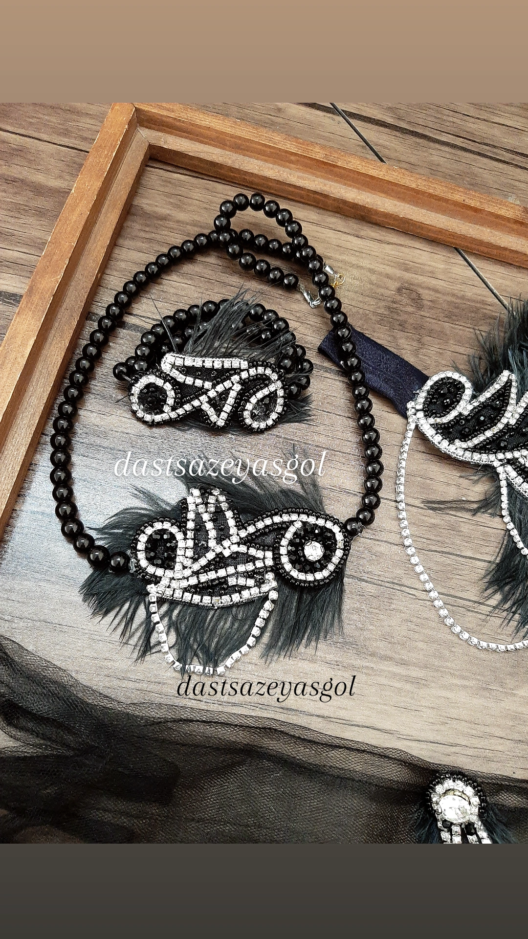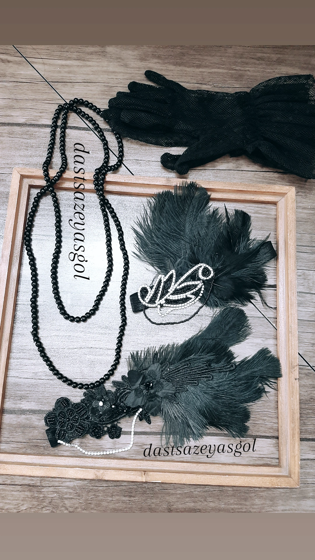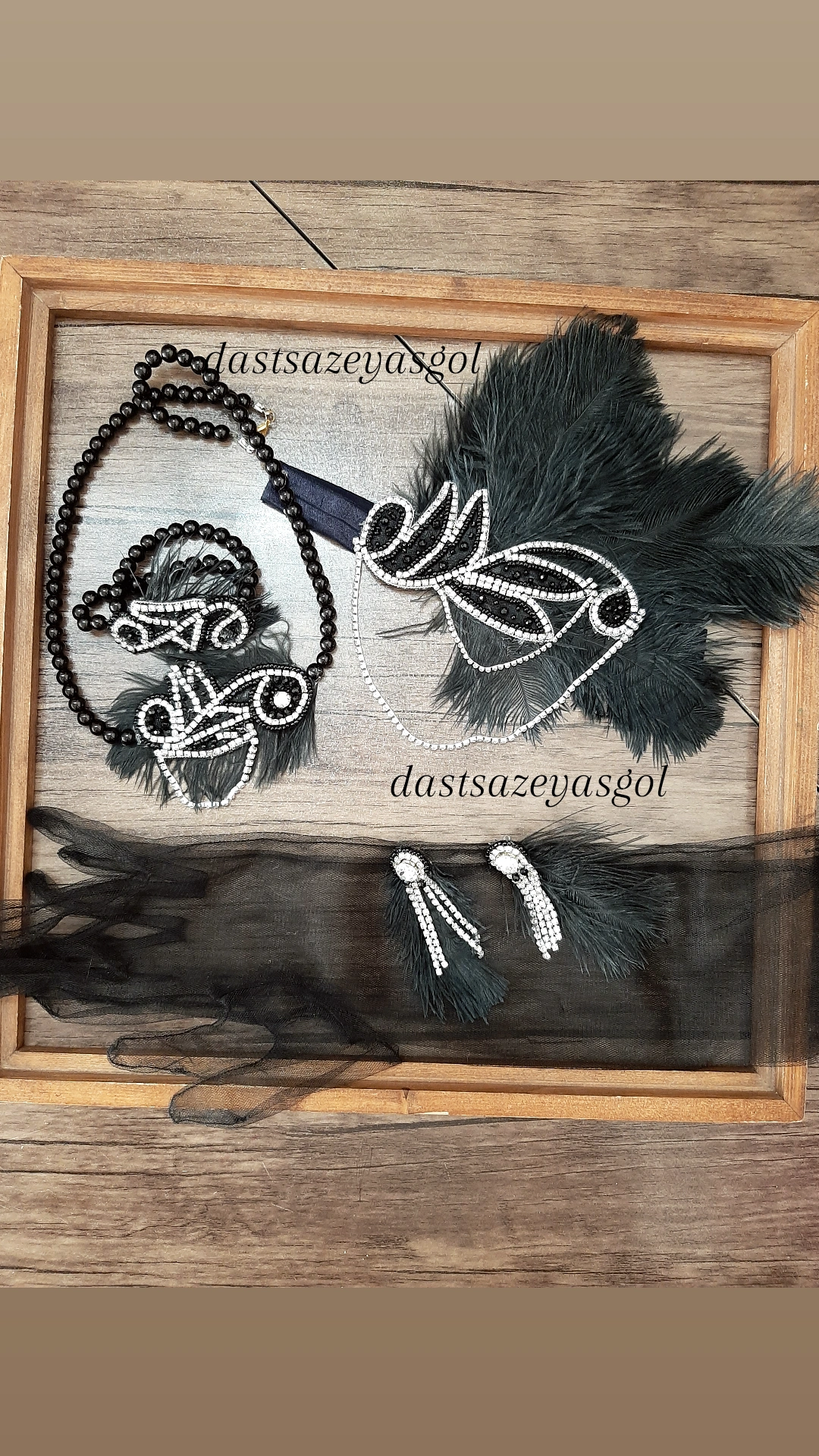 ست لاکچری گتسبی شامل هدپیس، گردنبند، مچبند، شواره و دستکشهای توری بلند