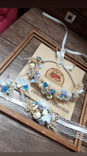 تاج گل عروس با ست مچبند و دسته گل تم سبز ابی