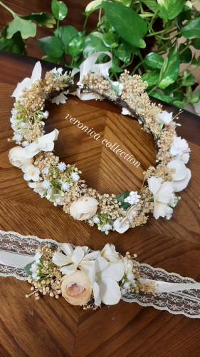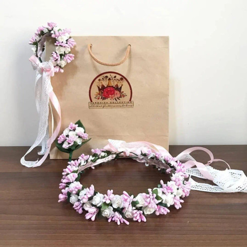 نیم تاج گل و مچبند با تم سفید صورتی